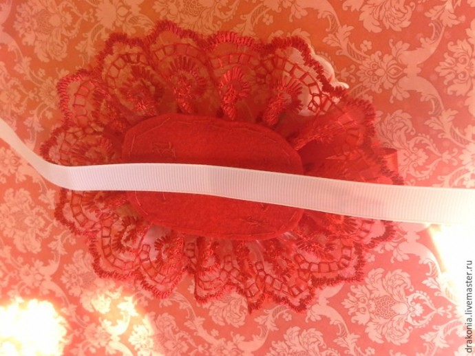 И еще несколькими стежками пришиваем к фетровой основе, аналогично поступаем с оставшимися двумя атласными лентами.