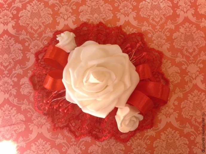 Далее по центру крепим большую розу, ее я крепила на клеевой пистолет, если какие-то лепестки не очень хорошо прикрывают «внутренности» браслета, каплей клея приклеивается лепесток самого нижнего яруса розы к фетровой основе и закрывает все некрасивости.