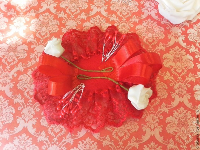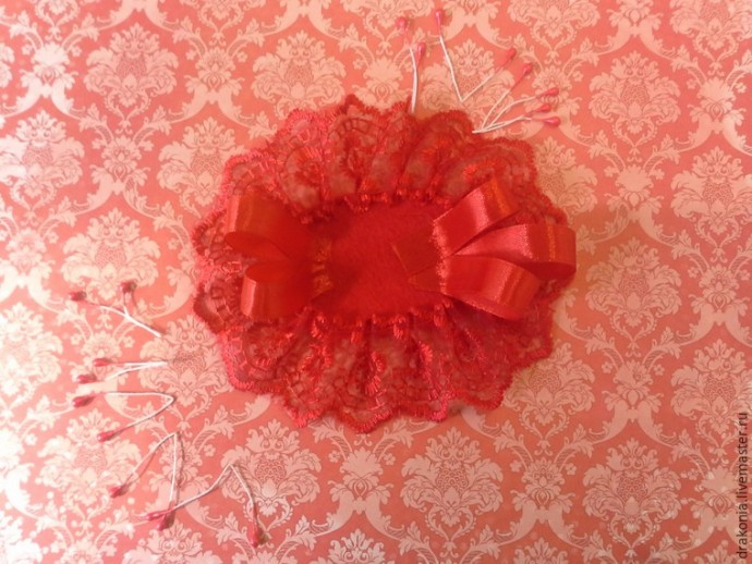 Дальше берем три атласные ленты разной длины и формируем из них композицию, сложив пополам, фиксируем несколькими стежками всю композицию сразу.