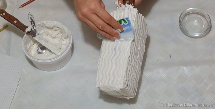 4. Наношу строительную шпаклевку на основе ПВА на пачку толщиное 2-3 мм и шаблоном делаю рисунок