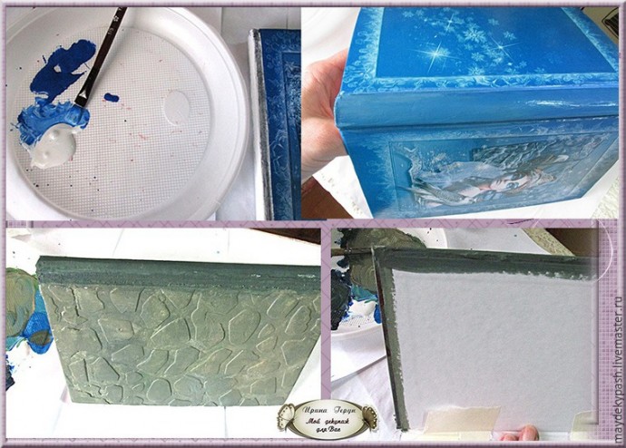 Через трафарет наносим рисунок камней на обратную сторону обложки.