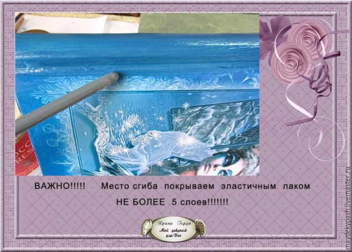 Место сгиба, покрываем эластичным лаком не более 5 слоев за время всей работы!