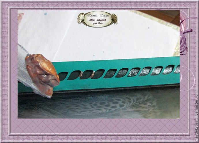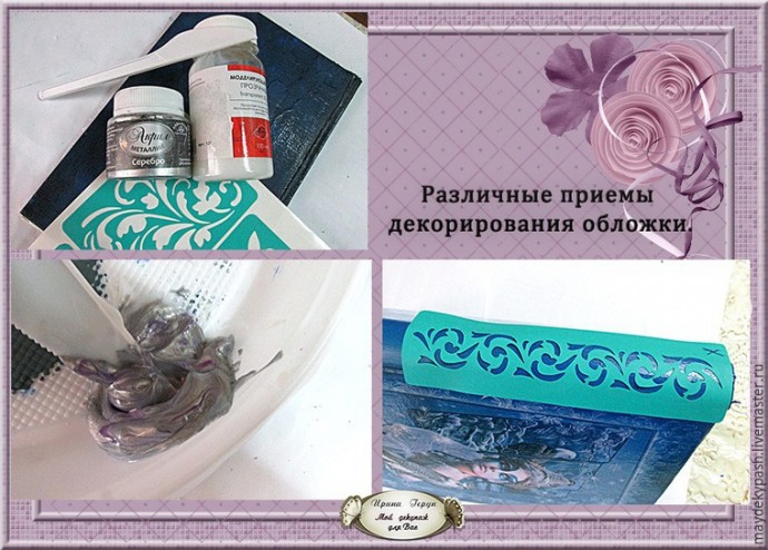 мешаем гель с серебряной краской и через трафарет нанесем на корешок.