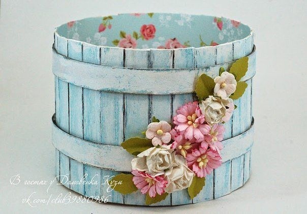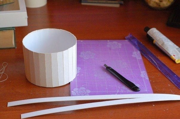 Вырезаем из пивного картона две полоски (это будут наши ободки на кадушке) шириной 1,5 см и длиной примерно 44,5 см (лучше взять с запасом и лишнее отрезать потом). Здесь такой нюанс: у меня пивной картон достаточно тонкий и очень хорошо сгибается. Если у вас он толстый, то его надо немного смочить и обернуть вокруг коробочки, и подержать так до высыхания, чтобы он принял форму.