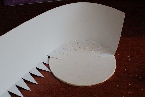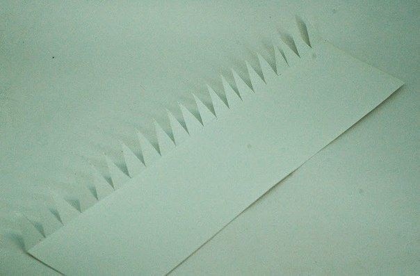 Далее из бумаги (я взяла для графических работ, можно для черчения, главное не сильно тонкую) вырезаем полоску длиной 42 см - это как раз ширина листа А3, мне как раз его хватило. Высоту можно рассчитать так: 10 см - высота дна + 2-3 см. На расстоянии этих 2-3 см бигуем и разрезаем треугольниками, как на фото.