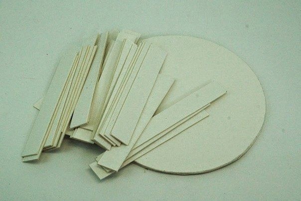 Из пивного картона вырезаем круглое дно (у меня диаметром 13,5 см) и нарезаем полосочки. Для такого диаметра, как у меня, я нарезала шириной 1,5 см и высотой 10 см.