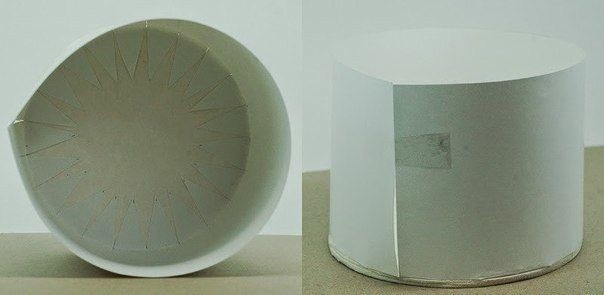 Из бумаги вырезаем круг диаметром на 1 мм меньше нашего дна и две полоски длиной 21 см и шириной 10 см (высота бочонка), все приклеиваем во внутрь.