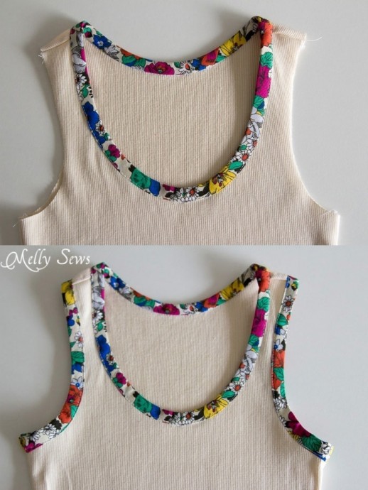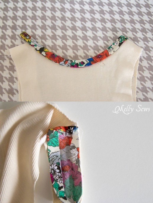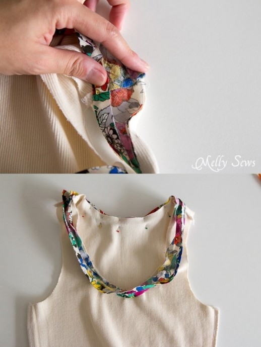 Горловина обрабатывается контрастной косой бейкой.