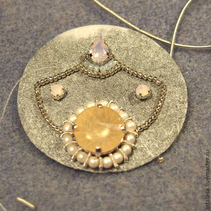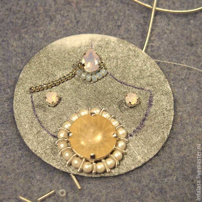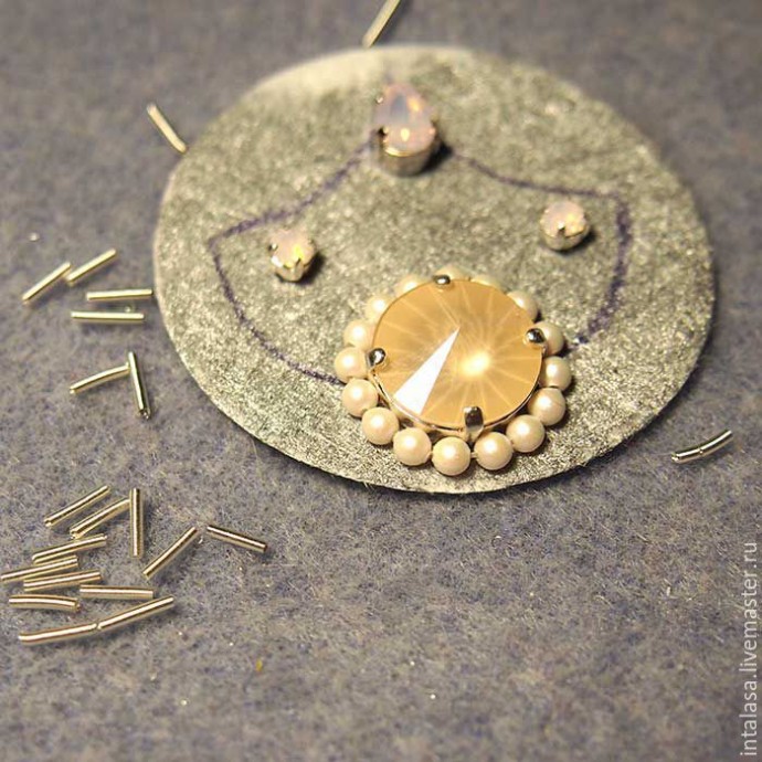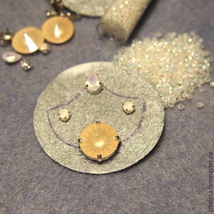 На клей Момент сажаю кристаллы в оправах. Таким образом они не разбегутся до того момента, как я их всех попришиваю. Как только клей подсохнет — все кристаллы будут пришиты.