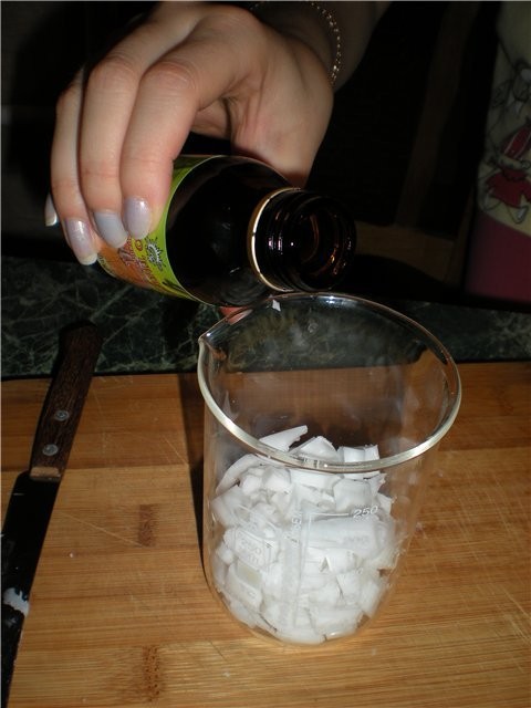 Режем мыльную основу (желательно мелко, чтобы она хорошо плавилась), добавляем немного масла, накрываем мерный стакан пленкой и ставим в микроволнувку, следите чтобы основа не вскипела