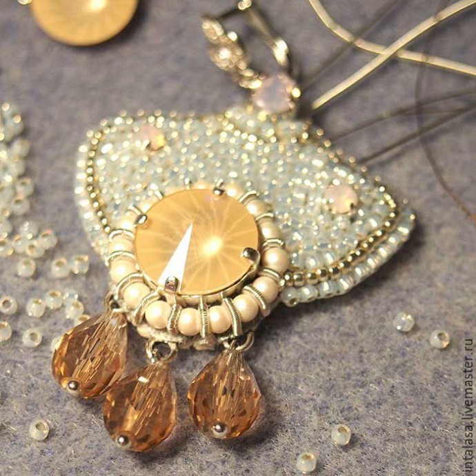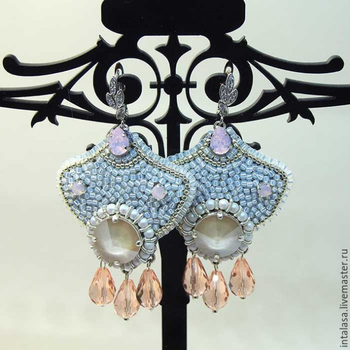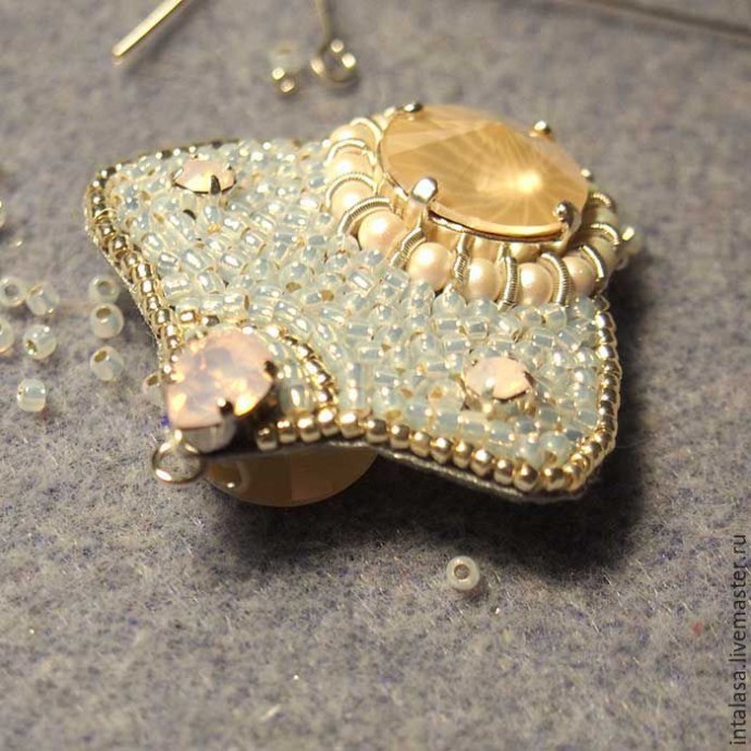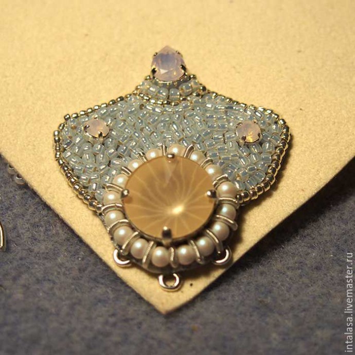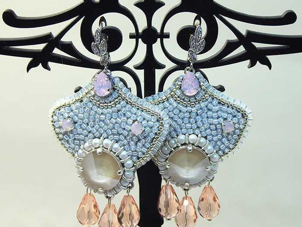 В конструкции серьги предусмотрены бусинки-капли, которые должны висеть снизу. Кто-то их пришивает, а мне больше нравится их привешивать с помощью пинов и коннектора, который я креплю на изнанке сережки.
