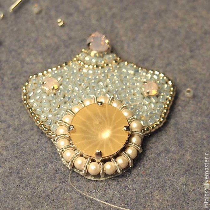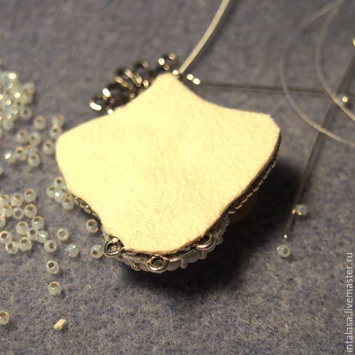 Бисером обшиваю сережку по краю, креплю к коннектору с помощью пинов капли.