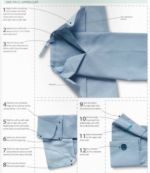 Обработка низа рукава узкой манжетойВ этом конкретном случае узкой манжетой.Не забудьте добавить пуговичку.