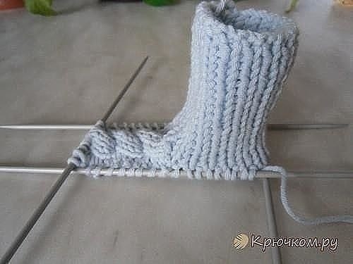 Наберите 40 петель (для стопы 10 см, возраст 3-6 месяцев). Распределите петли на 4 спицы и свяжите резинку 1×1 (20 рядов). Перекиньте 2 петли на первую спицу, чтобы получилось 12 петель — это передняя часть с косами. Следуйте схеме вязания переда: чередуйте лицевые и изнаночные петли, создавая узор. Сформируйте пяточку и боковые части, затем вяжите по кругу лицевыми петлями. Создайте "защип" для лучшей формы: провяжите 3 ряда изнаночными и 3 ряда лицевыми петлями. Начните вязание подошвы с носка, используя изнаночные петли. Закройте петли трикотажным швом с помощью иглы.