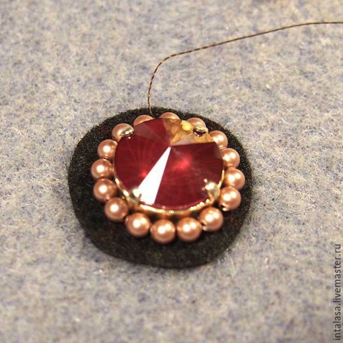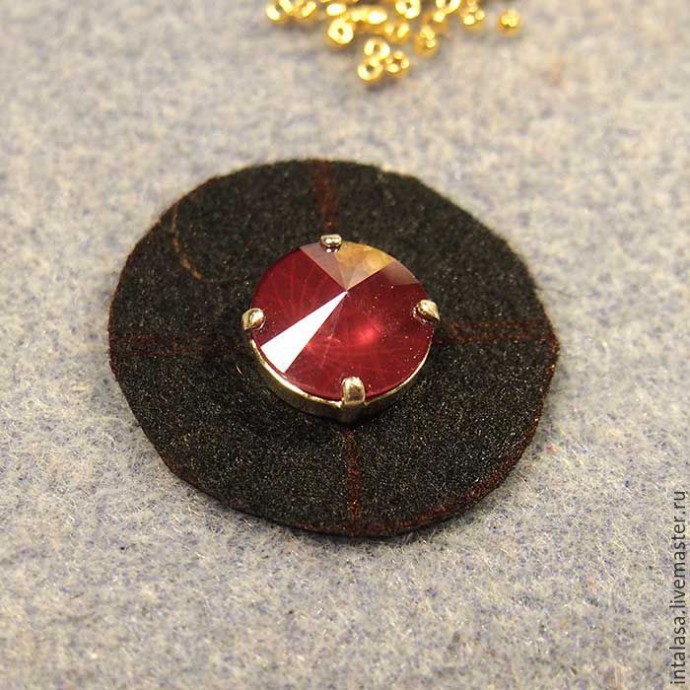 Следующий шаг — сделать для цветка серединку, заодно основу для всей броши. Кусочек фетра, на который я сначала приклеиваю, а потом пришиваю кристалл.