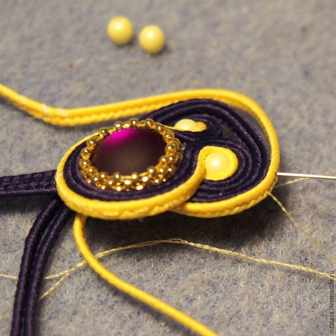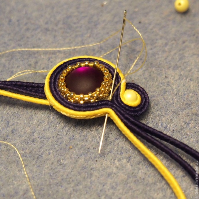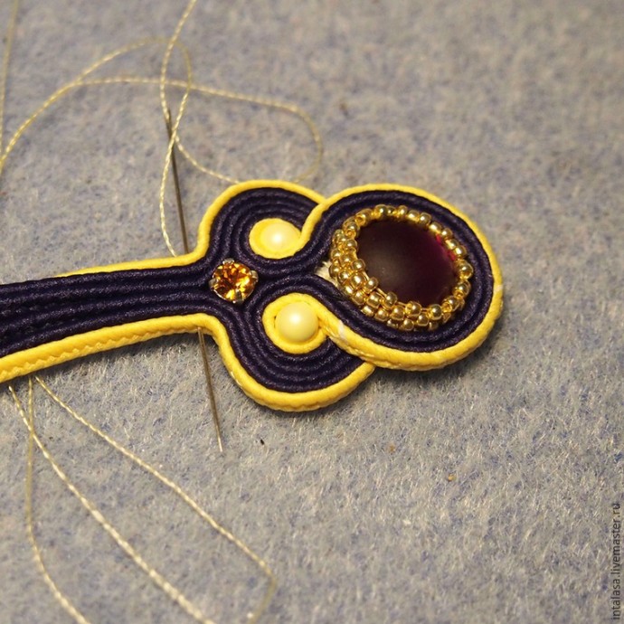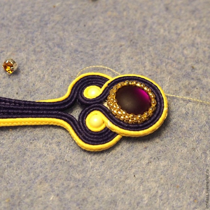 Следующим этапом берем шатон и вшиваем его в ложбинку между ушек, заодно подшивая рабочие хвостики сутажа.