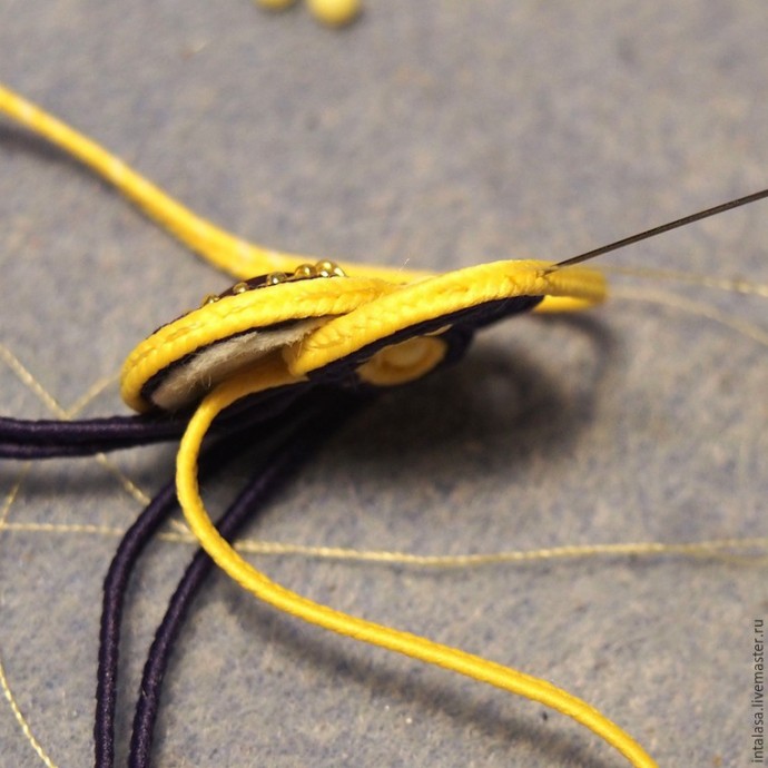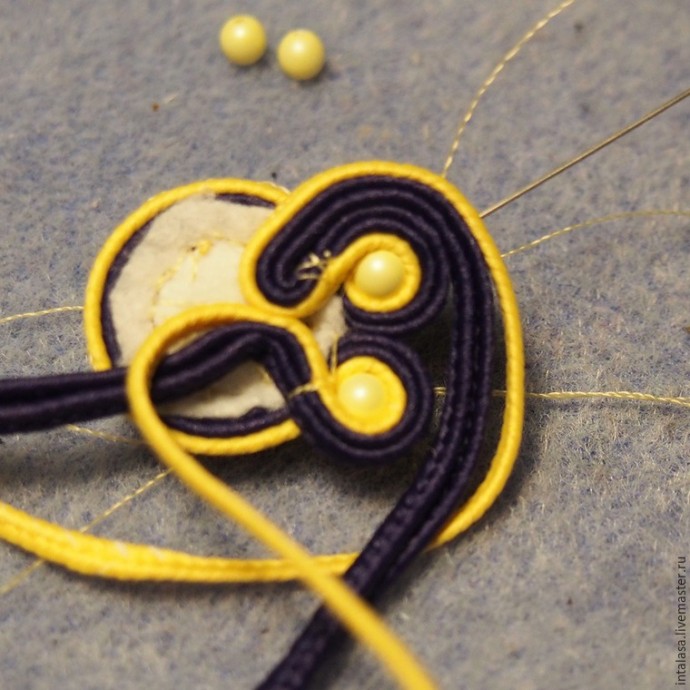 Рабочий хвостик сутажа заводим на изнанку изделия и закрепляем, подшивая.