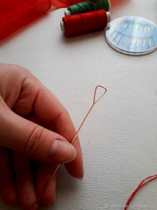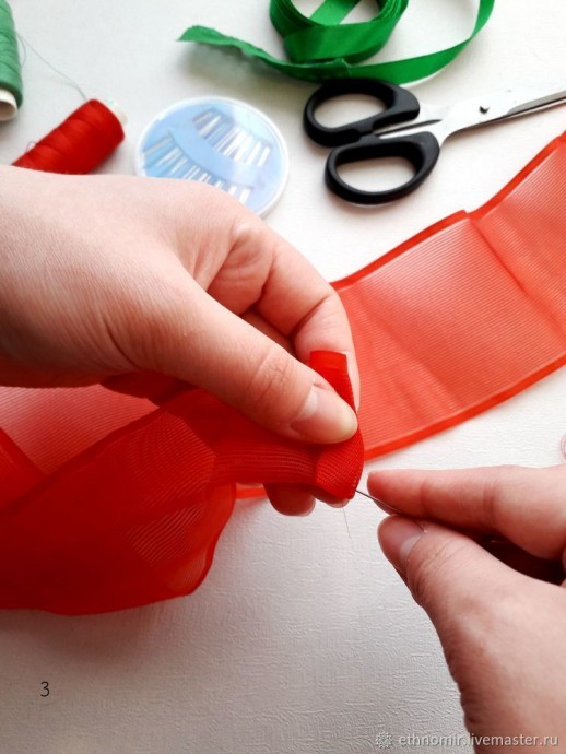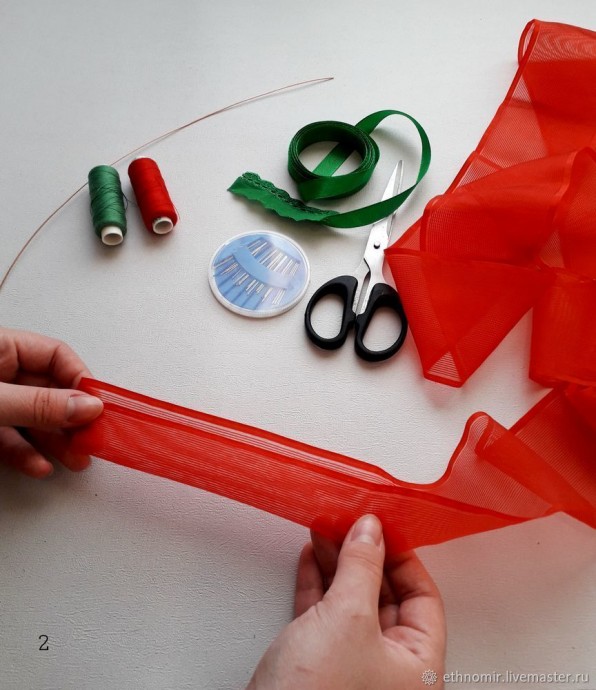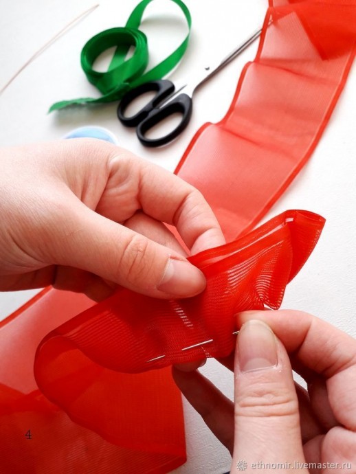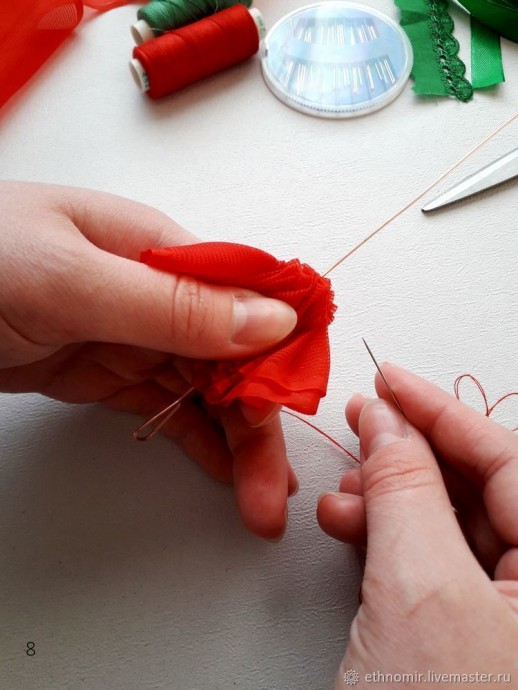 Делала первую гвоздичку для дочи из ленты капроновой, проще говоря — из красного банта. Вторую аналогично для сына из хлопкового кружевного шитья.