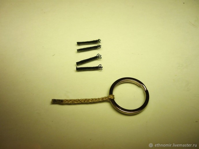 Три отрезка льняной нити по 15 см. вдеваем в кольцо для брелока.