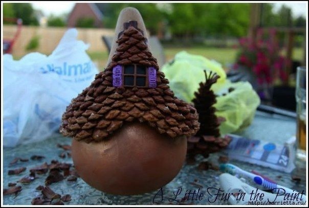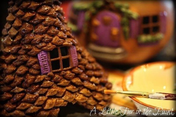 Сказочные декоративные домики из природных материаловИспользуйте свечи на батарейках или спрятанные внутри домиков налобные фонарики, чтобы осветить их.