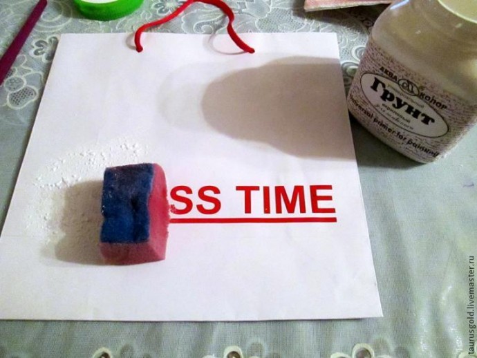 Во-первых, необходимо избавиться от надписей. Для этого "зачпокиваем" губкой с грунтом поверхность упаковки.