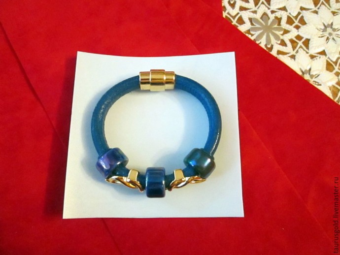 Возвращаемся к 1 полоске, на которой уже высох клей. Нужно наметить, где будет располагаться наше украшение. Этот шаг я не фотографировала, попытаюсь объяснить. Перевернули ткань пластиковой основой от себя и подвернули вниз ткань, как бы обернув пластик. Получится квадрат. По центру этого квадрата располагаем наше украшение. От верхних углов квадрата (а верх там, где сгиб ткани. Сгиба два, выбирайте любой, какой хотите, чтоб был верхним) мысленно проводим линию до пересечения с браслетом. Отмечаем пересечение точкой. Т.о. получаем 2 точки. Берем ленту шириной 0,5 см длиной 40 см, разрезаем пополам, опаляем кончики. Находим середину. Середину ленты совмещаем с отметкой и направляем ленту к углу квадрата.