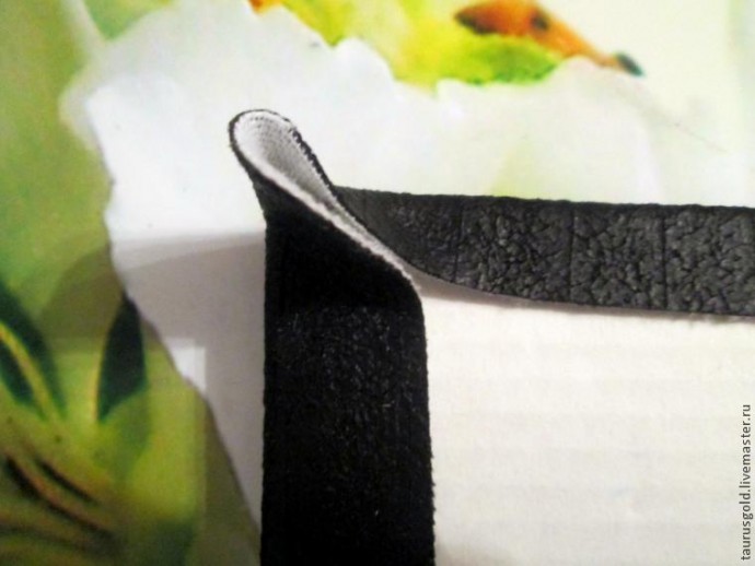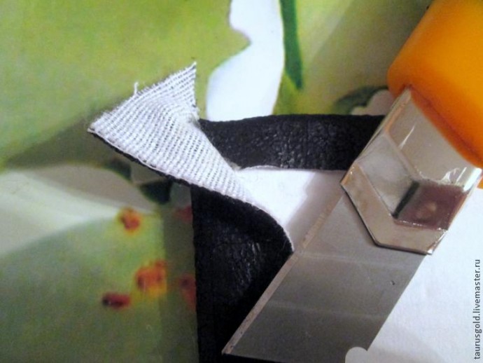 Аккуратно по диагонали срезаем излишки кожзама и подклеиваем уголки.