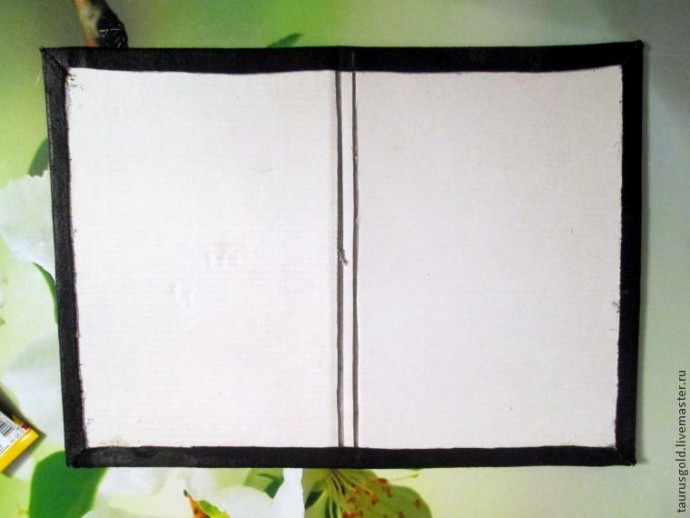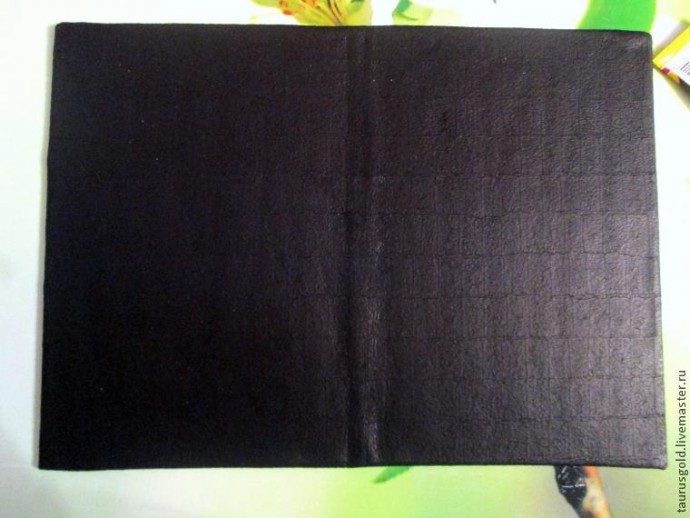 Теперь необходимо по большей стороне обложки приклеить корешок файла так, как показано на фото (обратите внимание, корешок заходит на припуск кожзама на 2-3 мм, эту нужно, чтобы закрыть некрасивый срез кожзама)