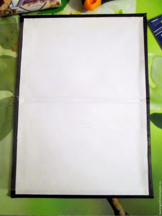 При наклеивании необходимо тщательно пройтись клеем в области корешка, если этого не сделать, при закрывании неминуемо образуются пузыри. Поскольку мне пришлось наклеивать несколько листов бумаги, то стыки все равно видно, и я решила прикрыть этот слой бумагой упаковочной, благо, ее формат позволяет сделать это без стыков. Я надеюсь, на фото видно, что файл слева, его корешок спрятан под бумагой.