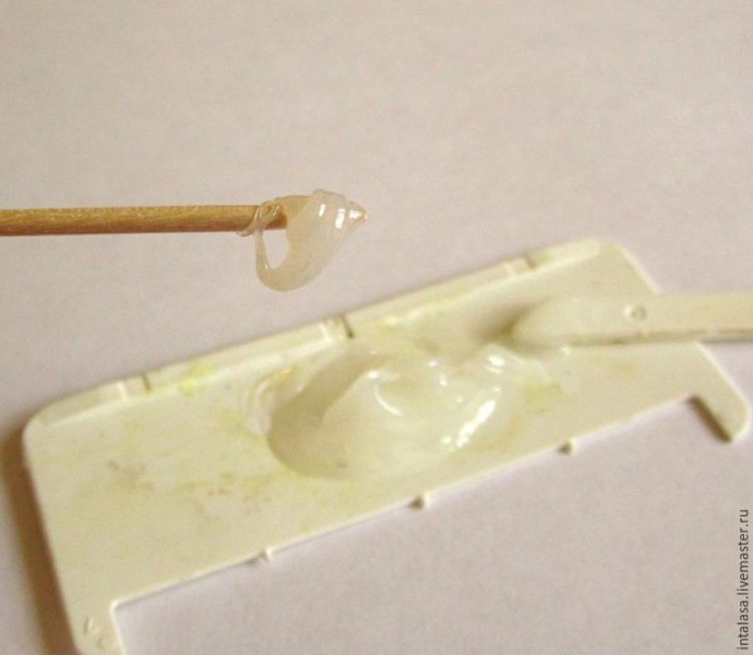 После чего сверху кладем и аккуратно выравниваем риволину, проконтролировав, чтобы ее "попка" достала до клея и измазалась в нем.