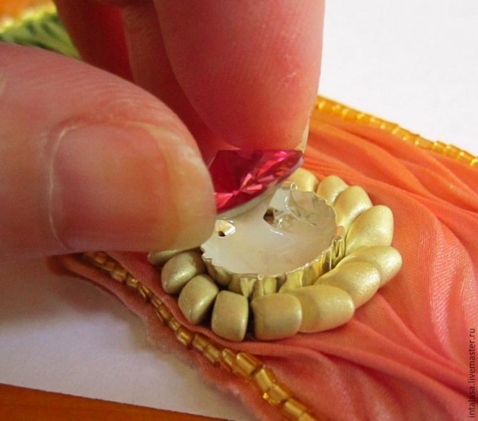 Для работы я собиралась взять относительно мягкий американский сутаж, поэтому вклеить кристалл термоклеем, предварительно обернув его сутажем и подшив, не получалось: эта разновидность шнура не хотела держать риволину. Помучавшись, сделать это, наверное, можно было, но сваровские стразы дорогие и на набитие руки, чтобы вшивалось -вклеивалось ровно и красиво их переводить жалко.