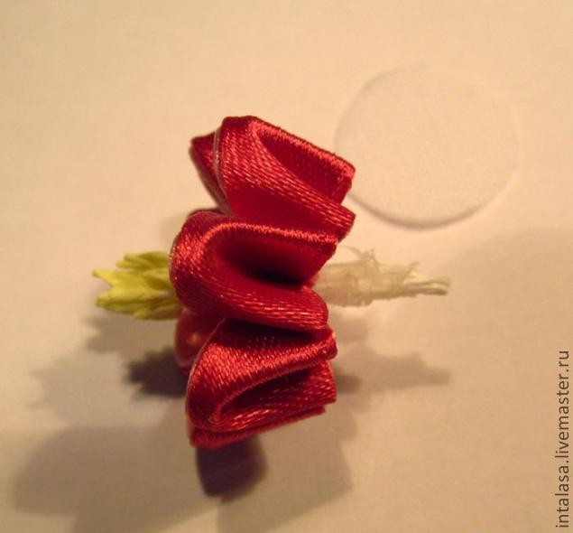 Вытаскиваем с изнанки эту палочку настолько, чтобы с лица осталась нужная нам длина тычинок, обрезаем вровень с изнанкой цветка