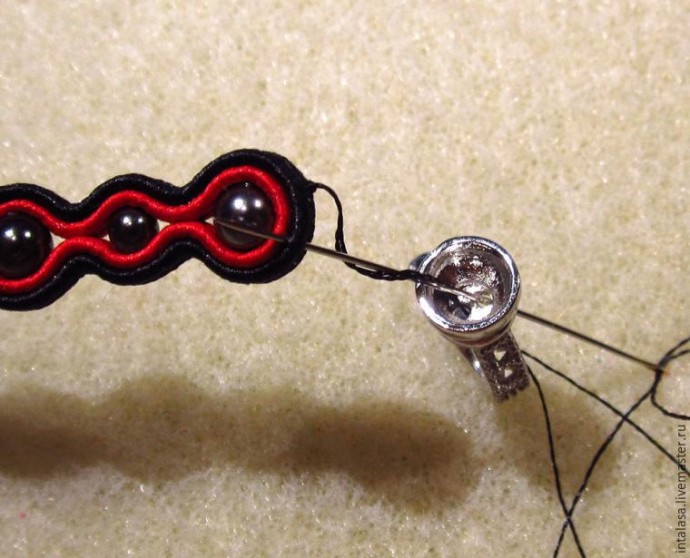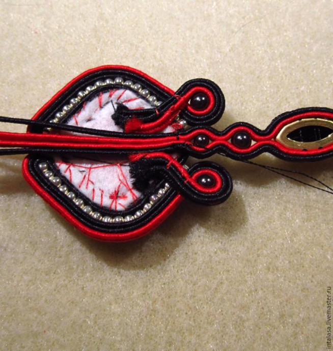 Сутаж охватывает каждую жемчужинку. Важно соединять его через более-менее равномерное расстрояние.
