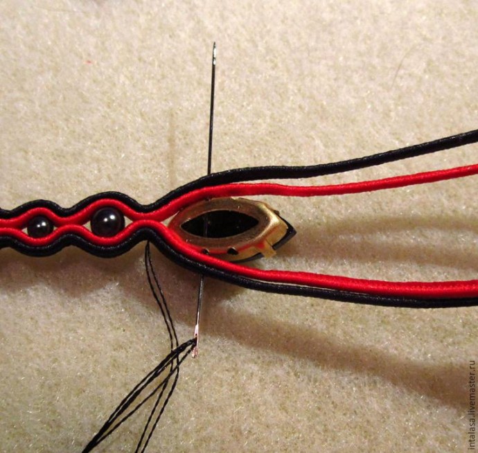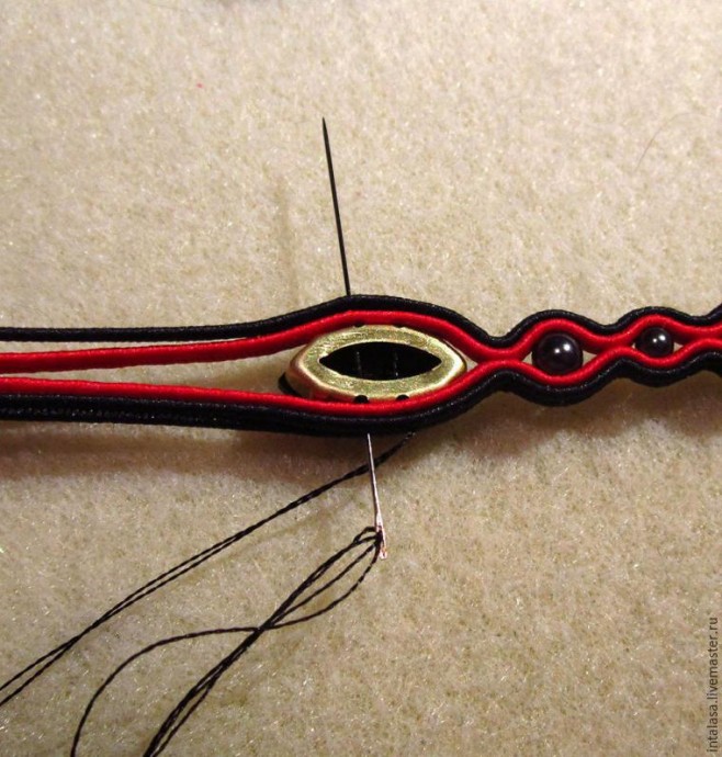 Бусинку же подшивала двумя стежками — туда и обратно. Тут, как и везде в сутажной вышивке, важно следить, чтобы иголка входила и выходила в желобок. Тогда стежки будут менее заметны, а сам сутаж будет лежать лучше.