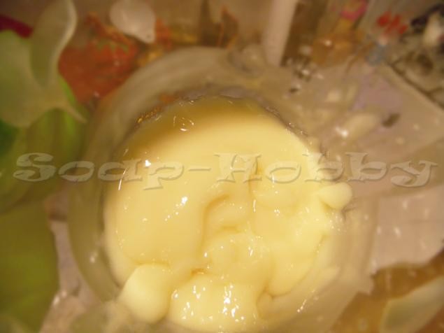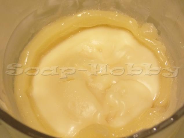 5) Как только температура выровнялась, добавляем щелочной раствор в масляную смесь. Мешаем блендером до наступления «следа». В стадию «следа» от лопатки или блендера на мыльной массе виден «след».