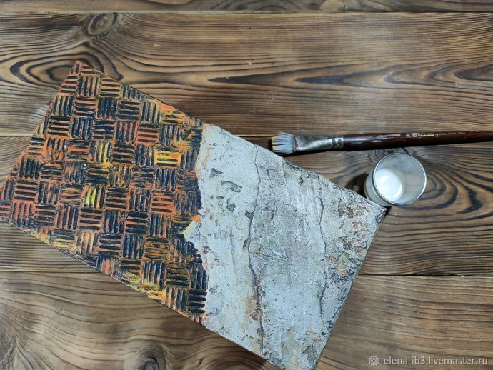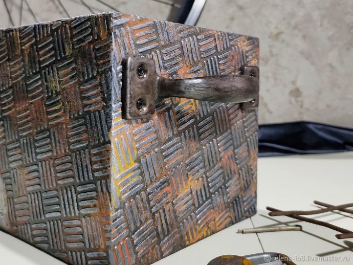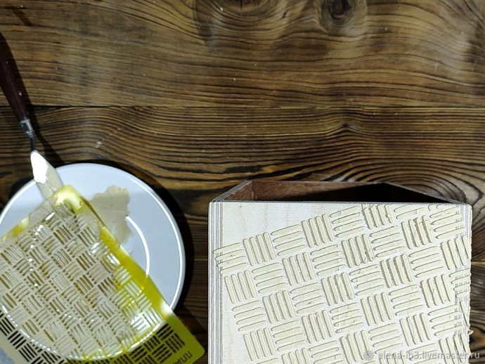 Вся заготовка внутри и снаружи обработана грунтом глубокого проникновения на 2 слоя с промежуточной шлифовкой. Покрываем 2 слоями морилки для дерева. Каждому этапу даем высохнуть и покрываем 1-2 слоями матового лака. Если ворс фанеры сильно поднимается шкурим после каждого нанесения морилки. У меня морилка легла неровно в местах склейки. Поэтому развела пожиже краску умбра жженая и замаскировала эти места. Этот шаг можно пропустить. Приступаем к имитации металла. Подбираем нужный трафарет. Наносим на то место где хотим видеть металл. Идея 50 на 50 металл и бетон. Ровные края не обязательны. Использую шпатлевку по дереву. Советую не торопится, мыть и сушить трафарет после каждого нанесения. Мне захотелось, чтобы фактура заходила и на бортики короба. Это требует времени и внимательности. Не оставляйте шпаклевку внутри, стирайте излишки влажной салфеткой.