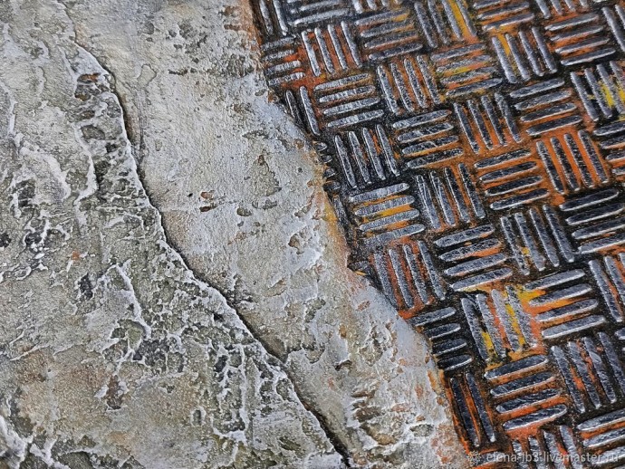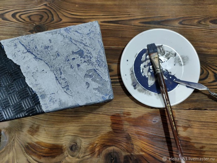 Скотчем с рваным краем отмечаем, где будет бетон. Наносим разнонаправленными движения. Плоскостью мастихина поднимаем шубу и через 2-3 минуты сглаживаем. Задача нанести неравномерно и фактурно. Тут как говорится как рука ляжет. Можно остановится на одном слое. А можно нанести 3 как у меня. Каждый слой просушиваем. После высыхания немного зашкуриваем пики и то, что отваливается без нажима.Смесь может сильно сыпаться, особенно без ПВА. Удаляем пыль. Покрываем 2 слоями лака.