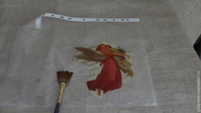 И снова сушим. А теперь начинается самое интересное — ищем салфетку. Так как бутылочка делается для святой водички, то ангелочки будут в самый раз.