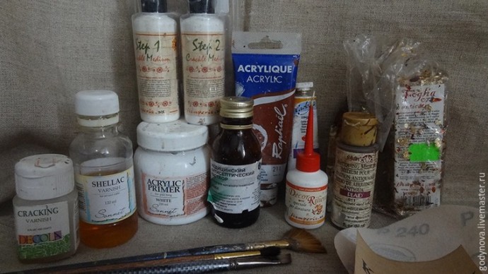 2) краски акриловые, краска масляная-умбра для затирки трещин;