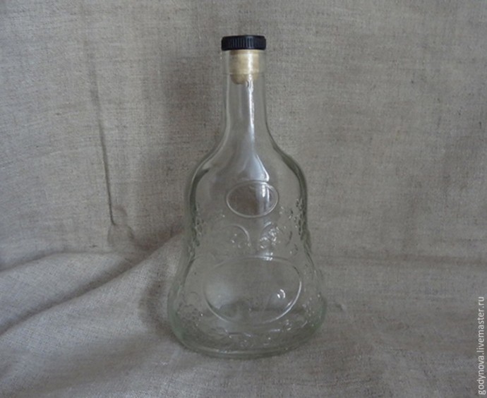 Вот такую бутылочку я буду декорировать. Обезжирим ее. Нанесем спирт на ватный диск и просто протрем.