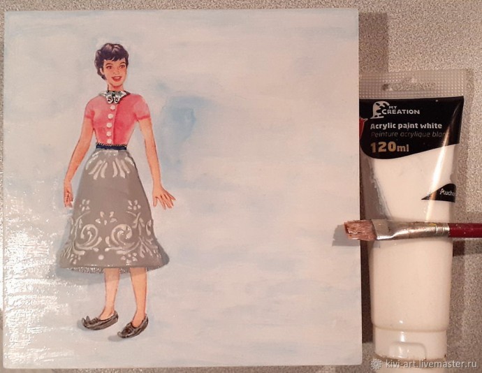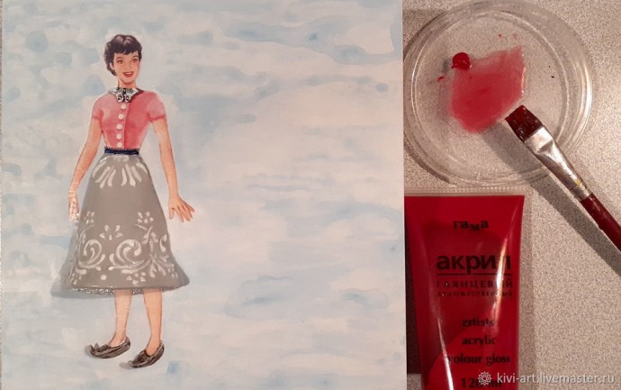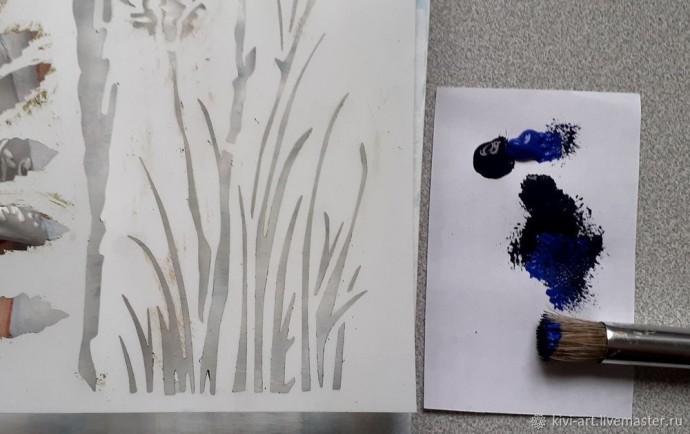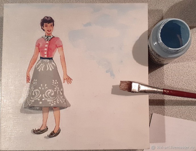 Сначала я нанесла разводами, сильно разбавленную водой, голубую акриловую краску.