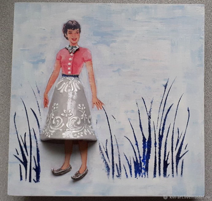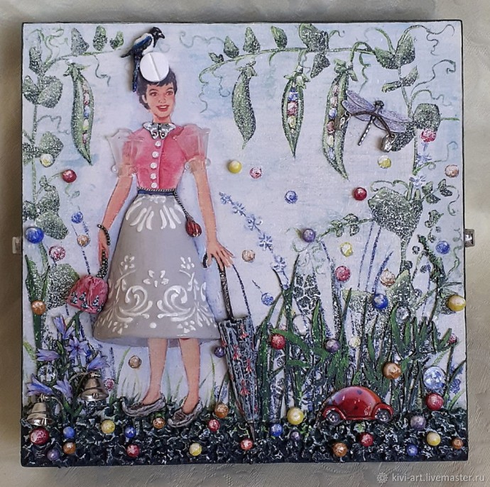Имелась квадратная белая крышка шкатулки — частично задекорированная (девушка). Необходимо было создать фон с заданной темой — заросли горошка. В работе я предполагала использовать чипборды.