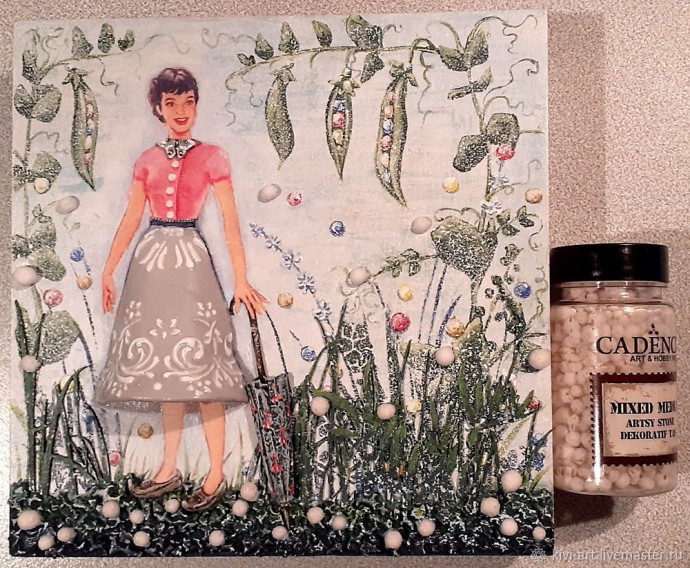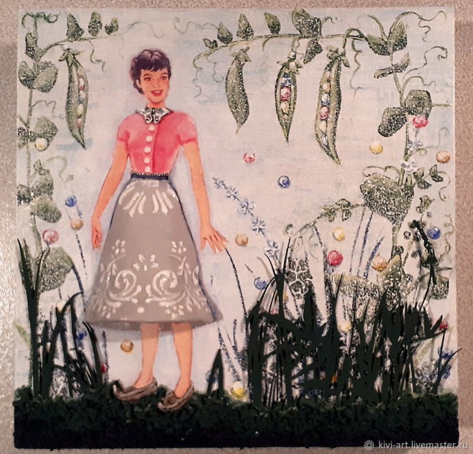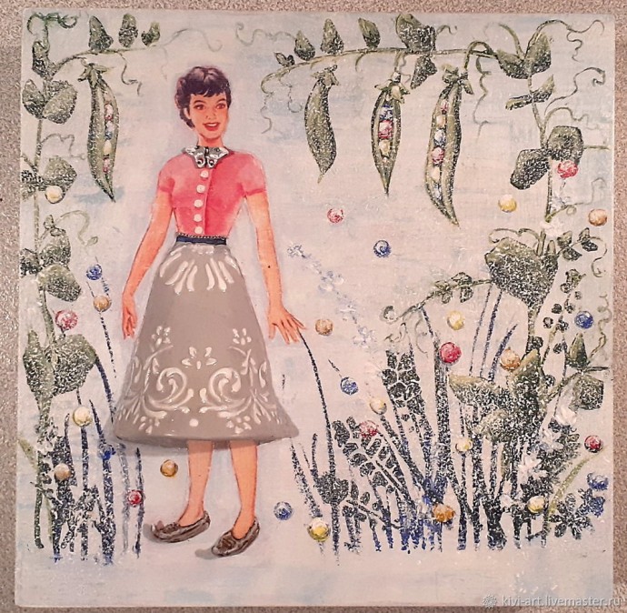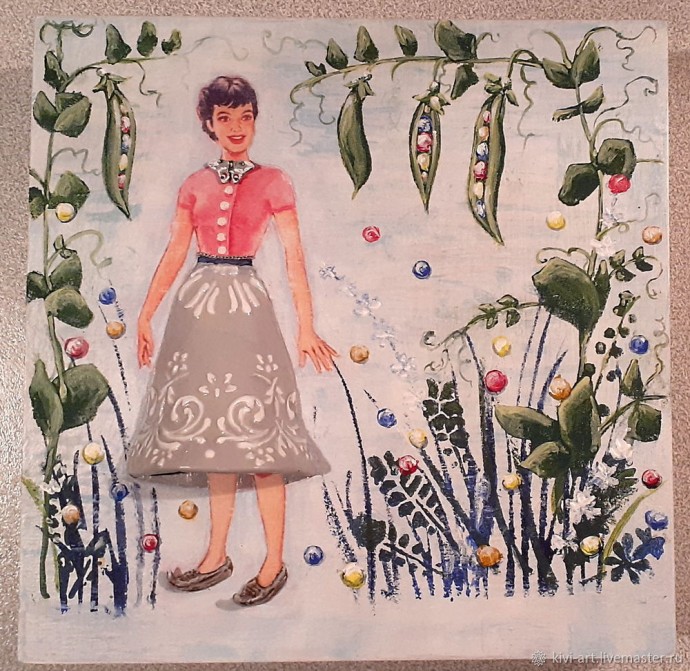 И уже на стебли нанесла листья и стручки гороха с помощью своих трафаретов.