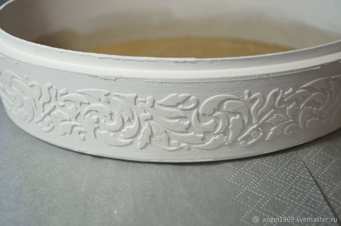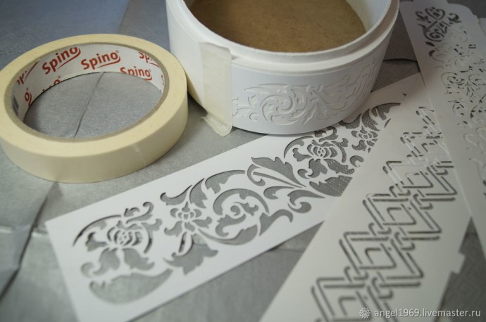 Для нанесения фактурного бордюра на боковинку шкатулки подбираем подходящий по рисунку и размеру трафарет, желательно с растительным орнаментом. Прикрепляем трафарет малярным скотчем к боковинкам.