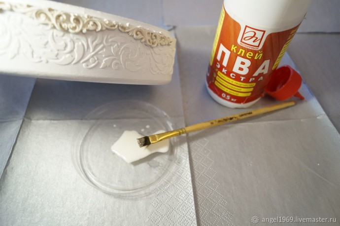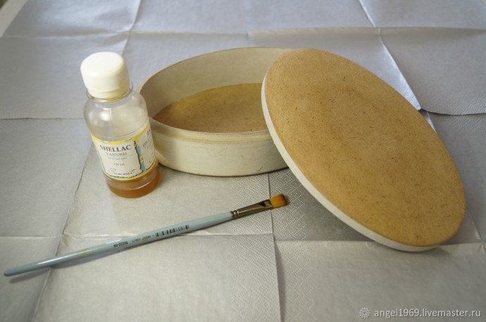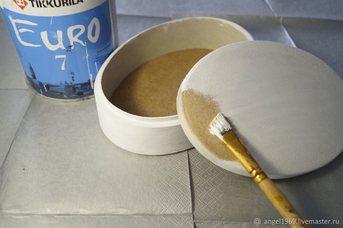 Заготовку из папье-маше обязательно нужно прошкурить и загрунтовать неводным лаком. Я это сделала шеллаком. После чего загрунтовать в два слоя акриловой белой краской из строительного магазина (у меня «Евро 7») или двумя слоями акрилового грунта (например, «Сонет»). Просушить 1 час.