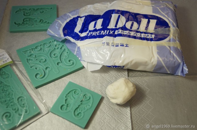 Начинаем работу с самозатвердевающей массой. У меня это масса «La Doll». Выбираем подходящие по рисунку силиконовые молды и плотно набиваем туда самоотвердевающую пасту. Излишки срезаем ножом.