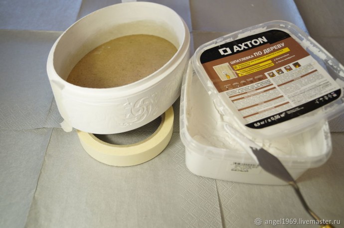 С помощью мастихина наносим на трафарет акриловую шпатлевку по дереву.
