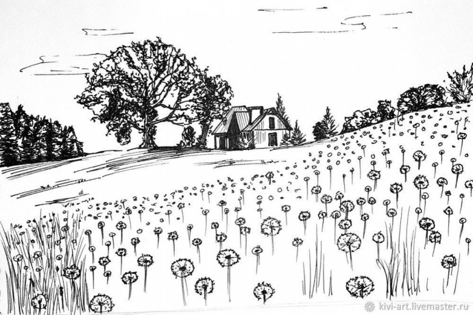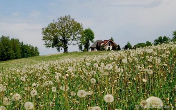 За основу я взяла фотокомпозицию с домиком, деревьями и полем одуванчиков.
