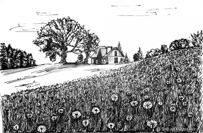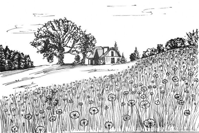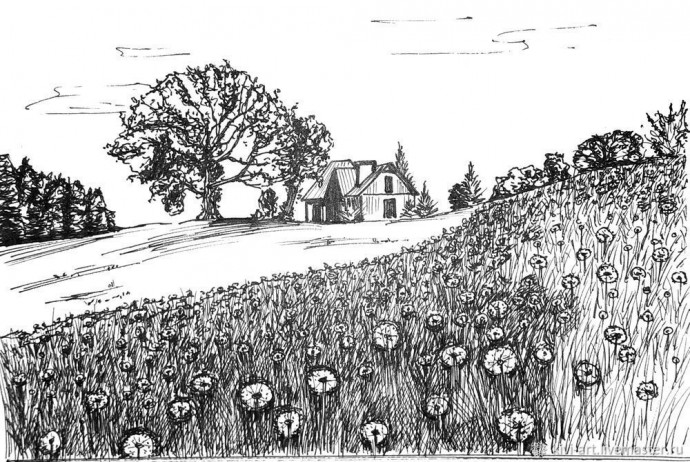 Одуванчики должны быть очень светлыми, но у нас нет возможности их осветлить. Значит у нас нет другого способа сделать их светлее, кроме как сделать темнее то, что их окружает. Делаем это штриховкой в разных направлениях.
