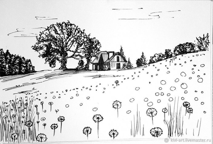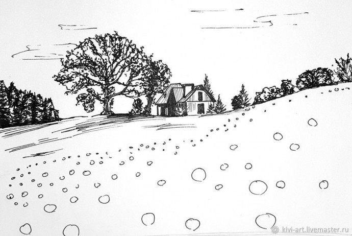 После того, как композиция намечена, отрисовываем задний план- домик и деревья. Используем разные виды штриха- черточки, точки, закорючки — в зависимости от того, какие линии преобладают в каждом предмете. Елочки и лиственные деревья выглядят по-разному. Не забывайте делать что-то светлее, а что-то темнее — чаще смотрите на фото и прищуривайтесь, чтобы увидеть светлоту.